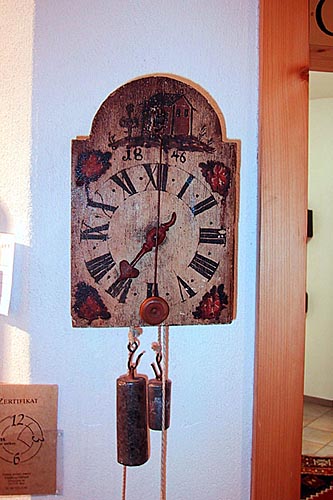 Gegenstand: Holzuhr unbekannter Meister Jahrgang: um 1846 Zifferblatt: Holz mit Zapler-Pendel Herkunft: Deutschland Garantie: 2 Jahre